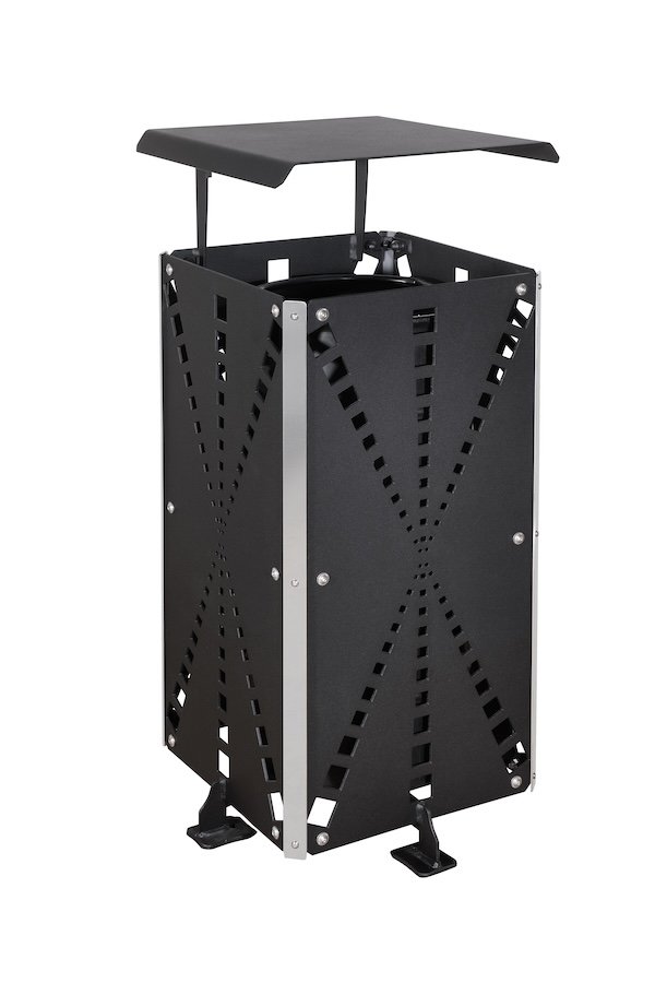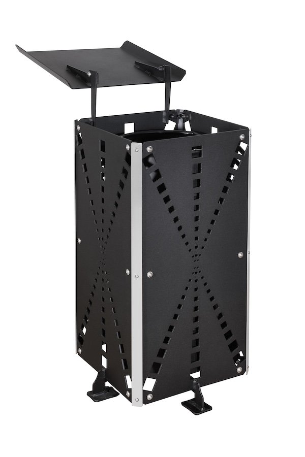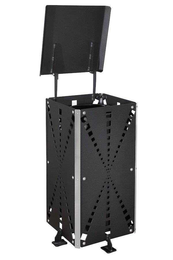 Nadčasový a praktický koš v celokovovém provedení s odklápěcí stříškou. Kovová konstrukce je ošetřena žárovým zinkem pro zvýšenou odolnost vůči korozi a povrchová úprava je provedena práškovou barvou v černém matném odstínu s ozdobnými nerezovými pásky.
