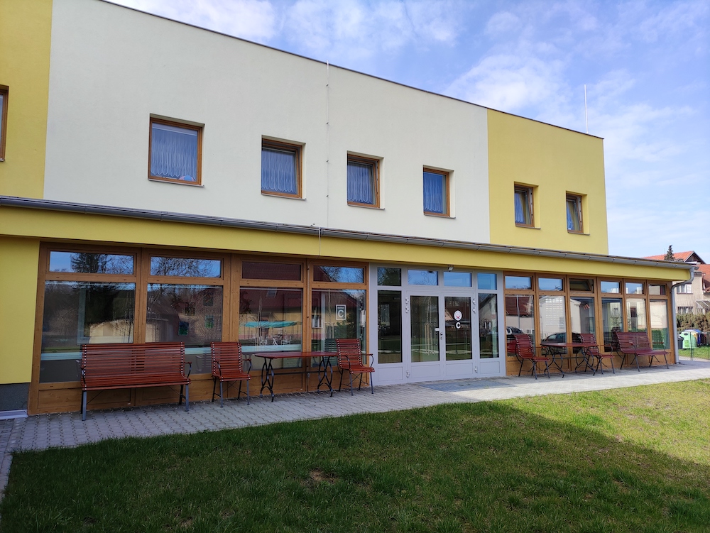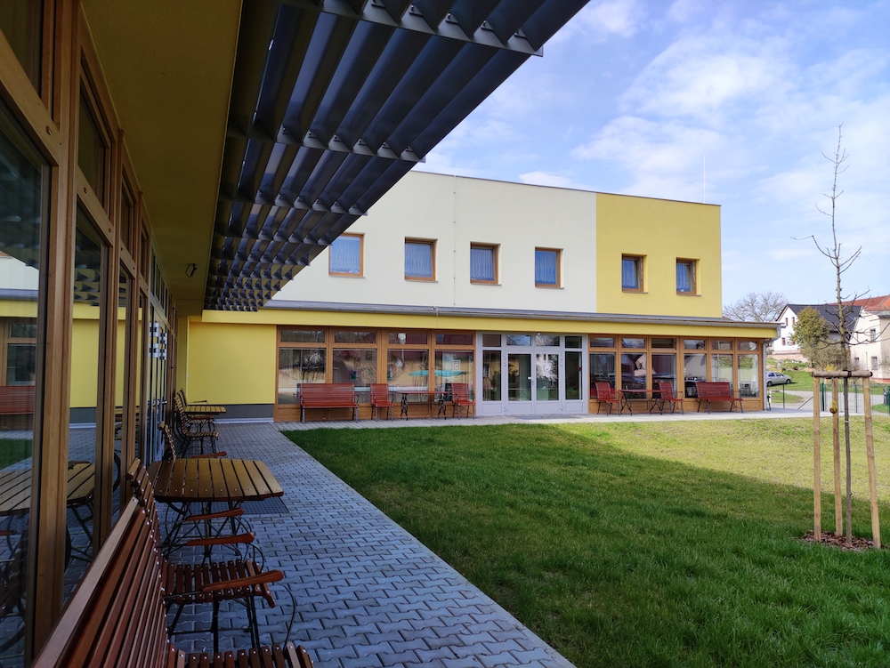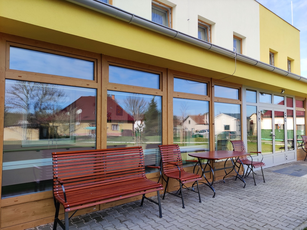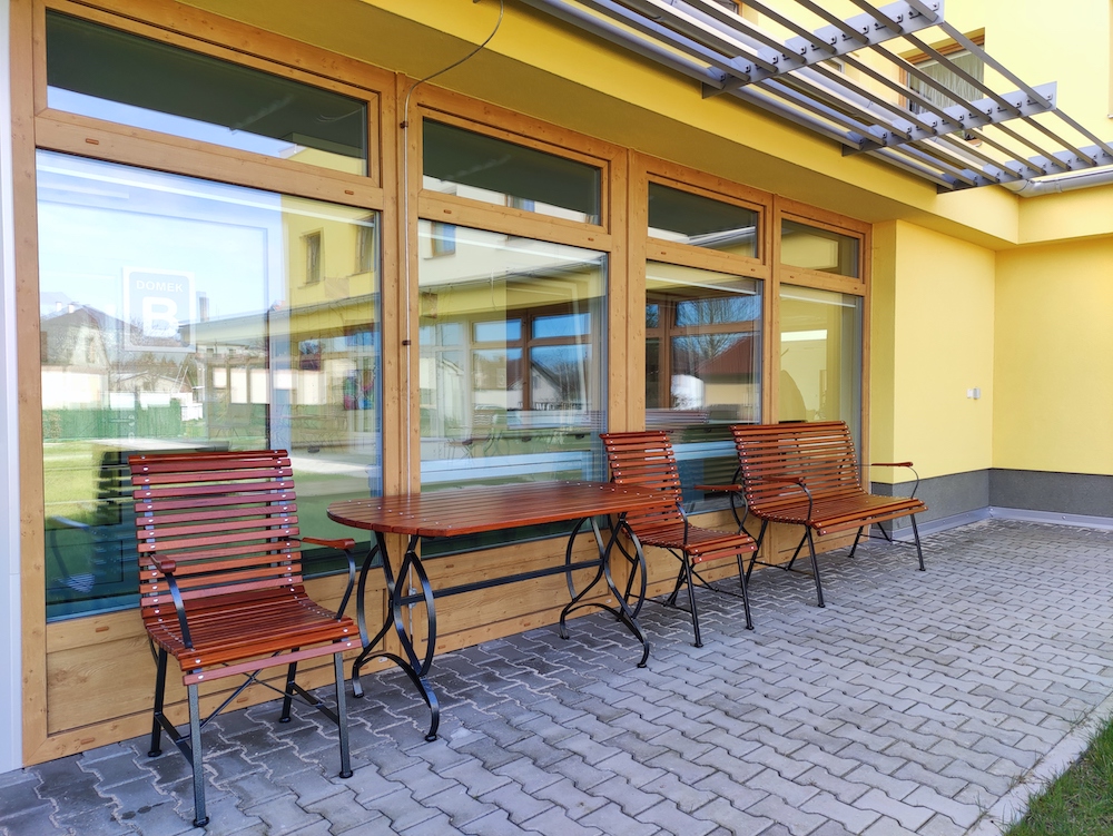 Dodávka anatomického nábytku v provedení dub, mahagon - anatomické lavičky Amálie, anatomická křesla a oválné zahradní stoly.