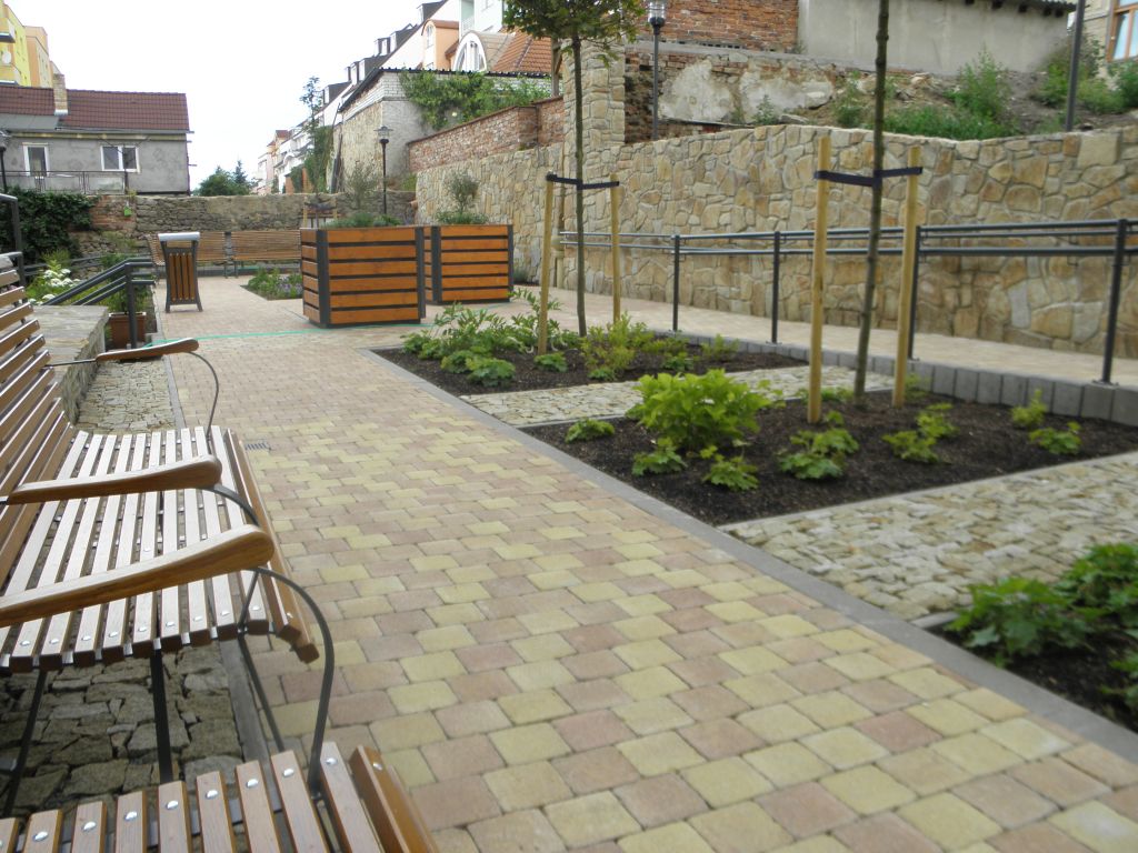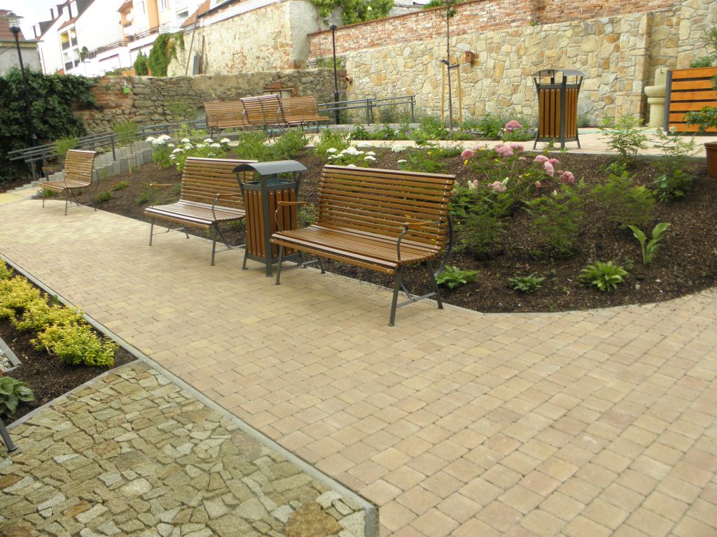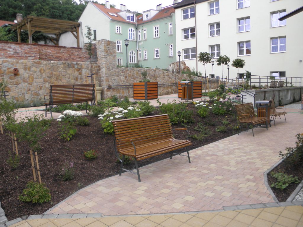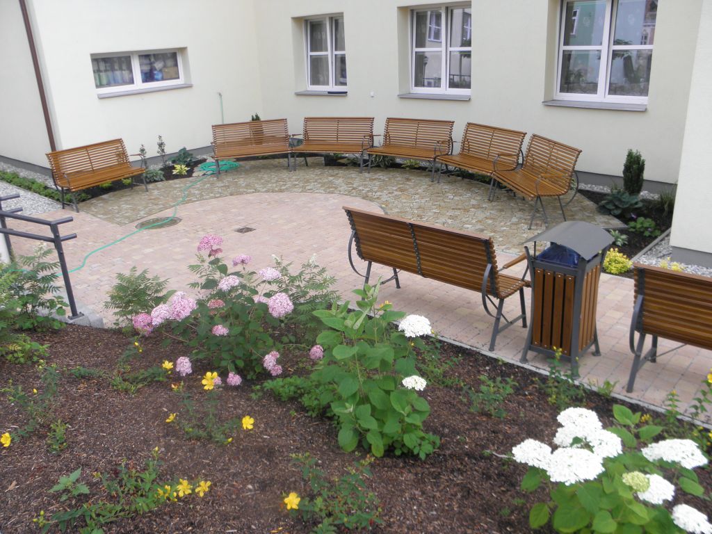 Realizace vybudování nádvoří v Domově důchodců v Hluboké firmou Dřevoplast CB s.r.o. Tučapy osazený zahradním nábytkem KovoKrab.