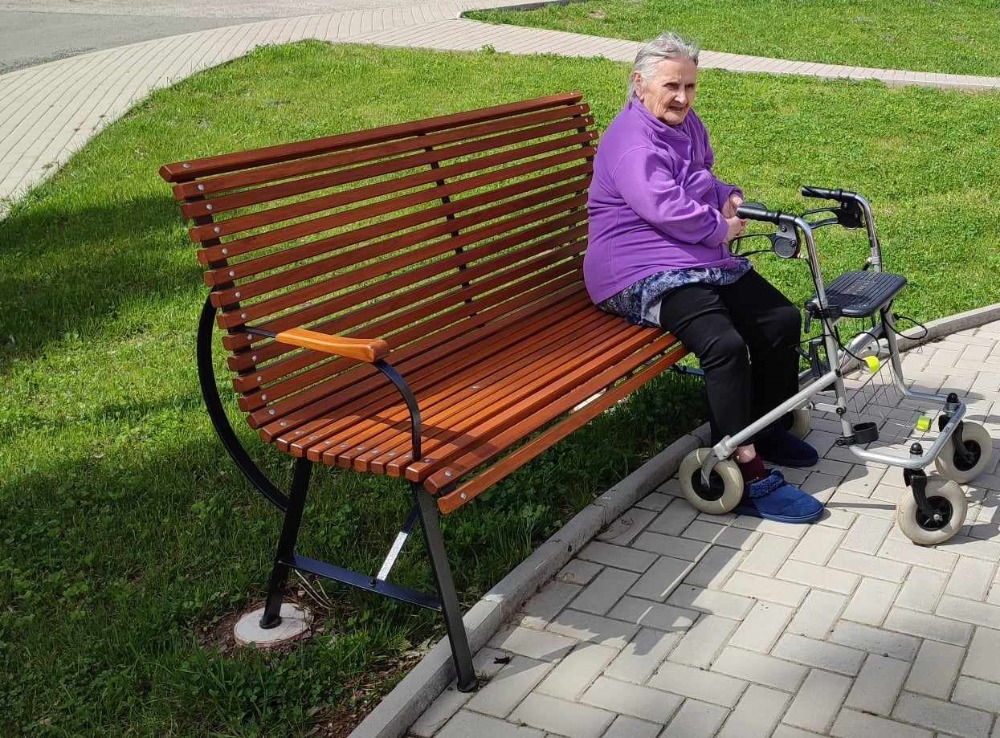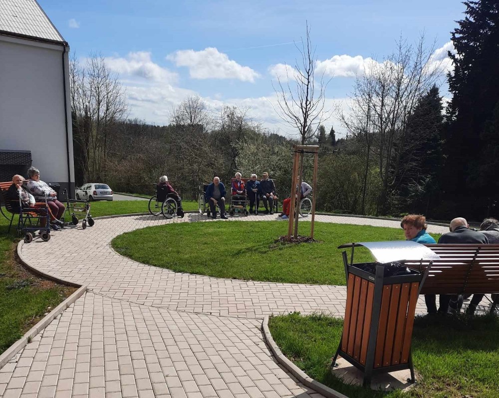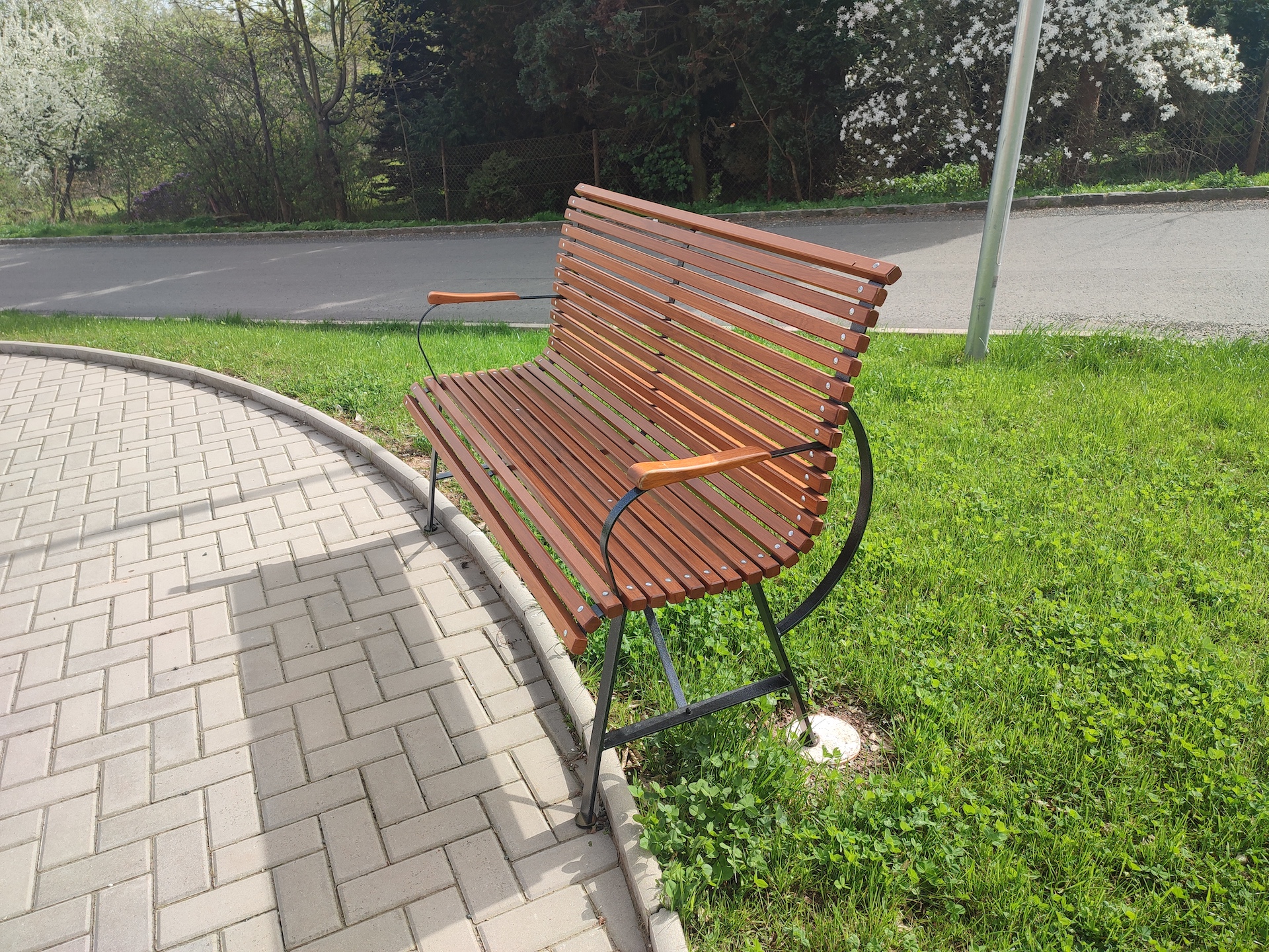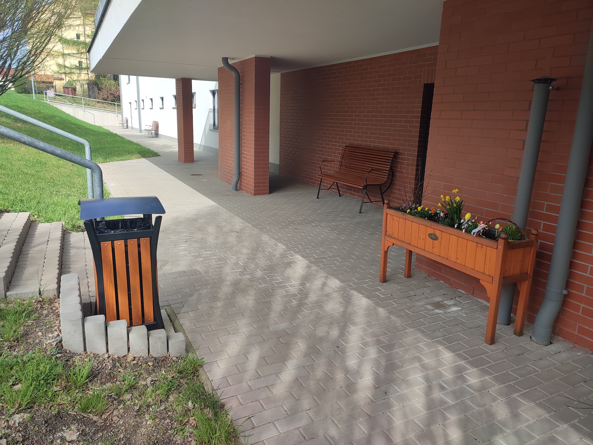 Dodávka dřevěného nábytku v dubovém a smrkovém provedení, odstín pinie. Anatomické lavičky Amálie se zvýšeným posedem, anatomická křesla se zvýšeným posedem a s prodlouženým oválným stolem, a jako doplněk Krabův koš.